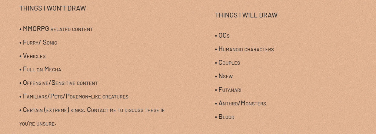 • Below is a basic rundown of what I feel comfortable drawing and what I don't enjoy drawing. If something isn't listed, feel free to DM or email me!